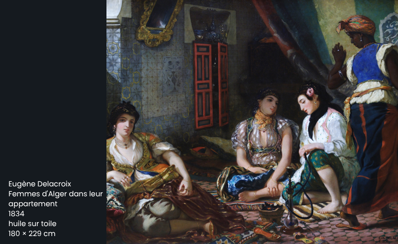 This painting reflects Delacroix’s fascination with North Africa. It offers a rare glimpse into an intimate, richly decorated Algerian interior. The colours and textures are luxurious—and groundbreaking in their portrayal of non-European life.